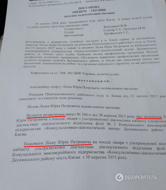 Нагадаємо, що 19 лютого 2018 року суд постановив відновити на роботі Юрія Ліску, також адміністрація КДЦ Деснянського району зобов'язана виплатити медпрацівникові зарплату за час вимушеного прогулу.